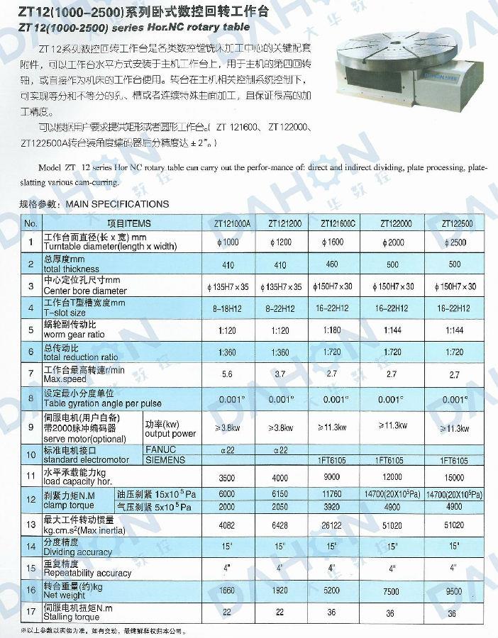 ZT12系列數(shù)控回轉(zhuǎn)工作臺(tái)是各類(lèi)數(shù)控鏜銑床和加工中心的關(guān)鍵配套附件,可以工作臺(tái)水平方式安裝于主機(jī)工作臺(tái)上,用于主機(jī)的第四軸,或直接作為機(jī)床的工作臺(tái)使用。轉(zhuǎn)臺(tái)在主機(jī)相關(guān)控制系統(tǒng)控制下,可實(shí)現(xiàn)等分和不等分的孔、槽或者連續(xù)特殊曲面加工,且保證很高的加工精度。