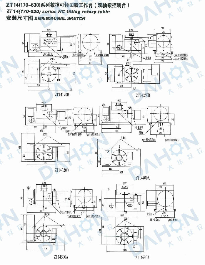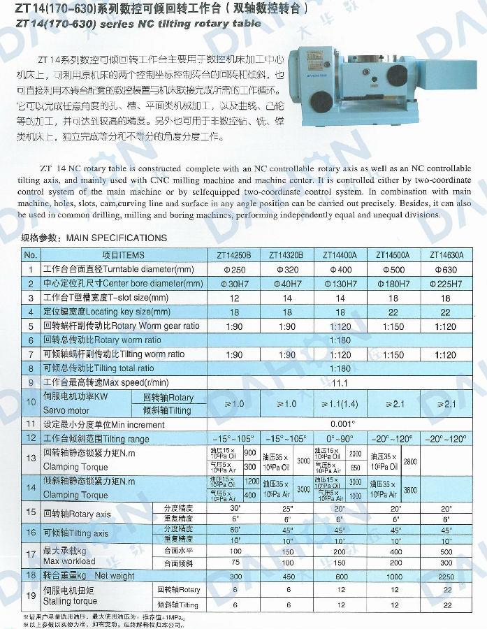 ZT14系列數(shù)控可傾回轉(zhuǎn)工作臺(tái)主要用于數(shù)控機(jī)床加工中心機(jī)床上,可利用原機(jī)床的兩個(gè)控制坐標(biāo)控制轉(zhuǎn)臺(tái)的回轉(zhuǎn)和傾斜,也可直接利用本轉(zhuǎn)臺(tái)配套的數(shù)控裝置與機(jī)床聯(lián)接完成所需的工作循環(huán)。它可以完成任意角度的孔、槽、平面類機(jī)械加工,以及曲線、凸輪等的加工,并可達(dá)到較高的精度。另外也可用于非數(shù)控鉆、銑、鏜類機(jī)床上,獨(dú)立完成等分和不等分的角度分度工作。該設(shè)備是一種雙軸數(shù)控轉(zhuǎn)臺(tái)。