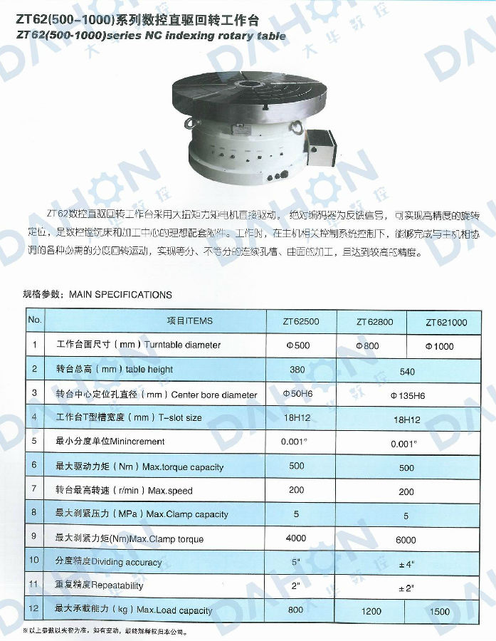 ZT62系列數(shù)控直驅(qū)回轉(zhuǎn)工作臺(tái)采用大扭矩力矩電機(jī)直接驅(qū)動(dòng),絕對(duì)編碼器為反饋信號(hào),可實(shí)現(xiàn)高精度的旋轉(zhuǎn)定位,是數(shù)控鏜銑床和加工中心的理想配套附件。工作時(shí),在主機(jī)相關(guān)控制系統(tǒng)控制下,能夠完成與主機(jī)相協(xié)調(diào)的各種必需的分度回轉(zhuǎn)運(yùn)動(dòng),實(shí)現(xiàn)等分、不等分的連續(xù)孔、槽、曲面的加工,且達(dá)到較高的精度。煙臺(tái)大華數(shù)控機(jī)床附件有限公司是數(shù)控機(jī)床附件設(shè)備的知名配套企業(yè),可生產(chǎn)多種型號(hào)數(shù)控直驅(qū)轉(zhuǎn)臺(tái)產(chǎn)品,技術(shù)一流,可定制研發(fā)。