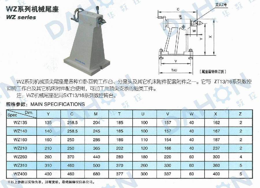 WZ系列機(jī)械頂尖尾座是各種立臥回轉(zhuǎn)工作臺(tái)、分度頭及其它機(jī)床附件配套附件之一。它與SKT13/16系列數(shù)控回轉(zhuǎn)工作臺(tái)及其它機(jī)床附件配合使用,可加工用頂尖支承的軸類工件。WZ機(jī)械尾座配用SKT13/16系列數(shù)控轉(zhuǎn)臺(tái)。